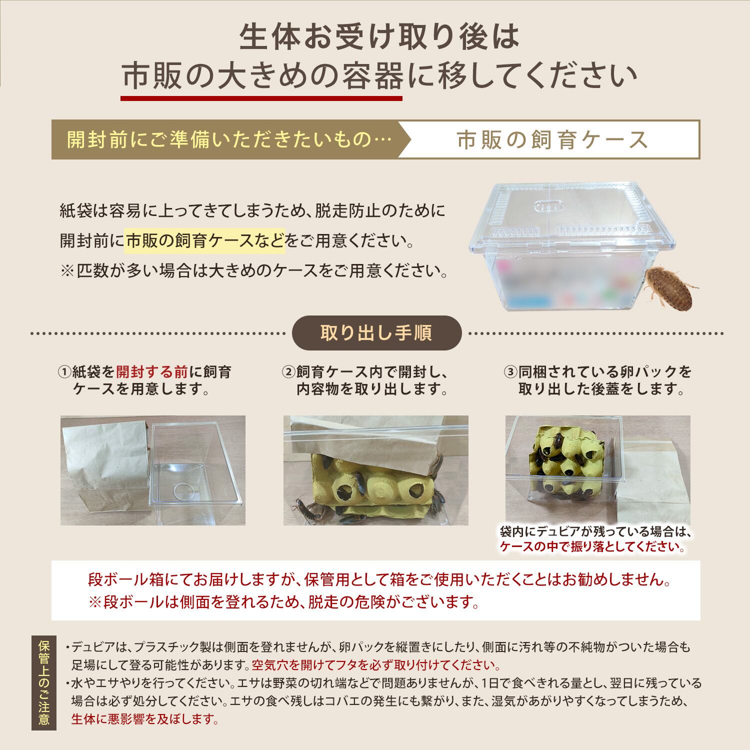 肉食熱帯魚、爬虫類・両生類、小型哺乳類、猛禽類、昆虫などの餌にオススメのデュビアです!栄養満点のオーガニック餌のみで育成された個体を、徹底した温度管理で生育!適正な管理で育て、プリプリと肉付きのよい個体を厳選してお届けします!